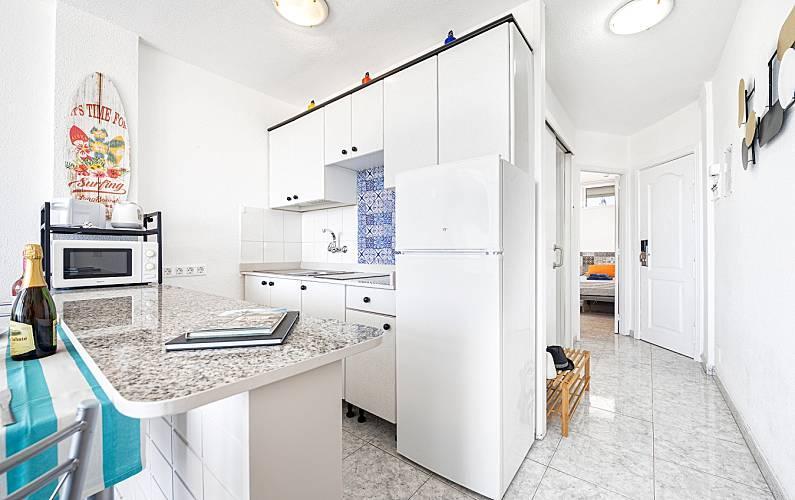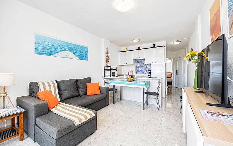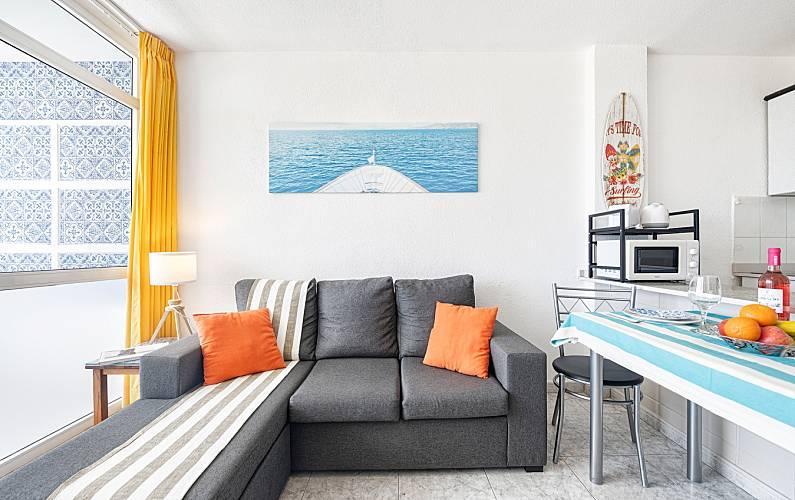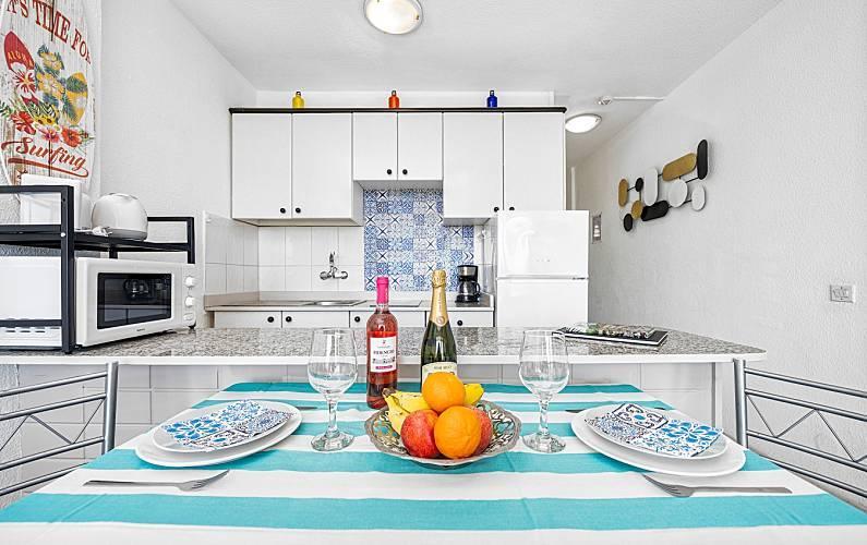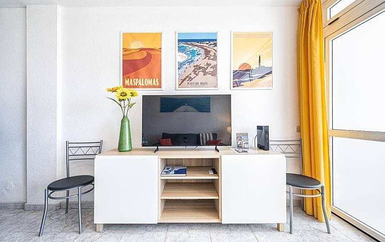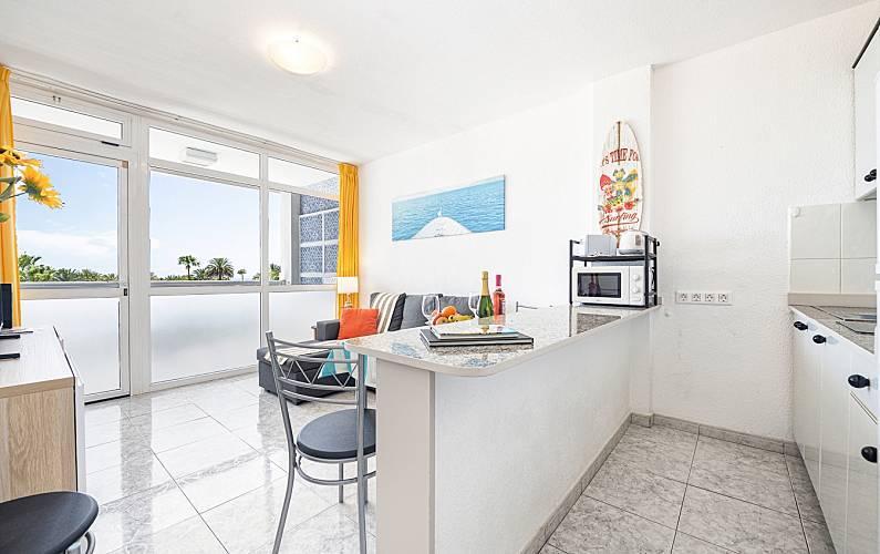The apartment is located in the heart of Playa del Inglés, the busiest and most attractive part of Maspalomas, right on Avenida de Tirajana, one of the city's main communication arteries, but in a quiet and safe area. The famous Yumbo shopping center is only 5 minutes walk away, the Cita 10 minutes, the famous dunes of Maspalomas and the beach 15 minutes. The apartment is easily accessible by public transport and several bus lines stop right at the door. All the necessary daily services are also available nearby such as banks, supermarkets, health services, etc. On the ground floor of the building, three economical and very practical restaurants are open every day of the year.