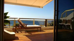 Direct beachfront access with stunning sea views. Guests can relax on the terrace or enjoy the lush garden.