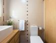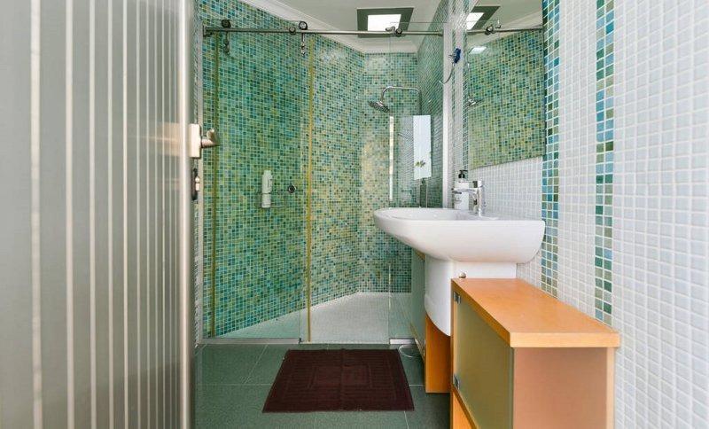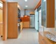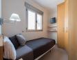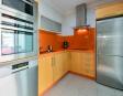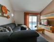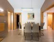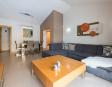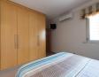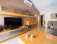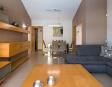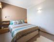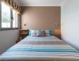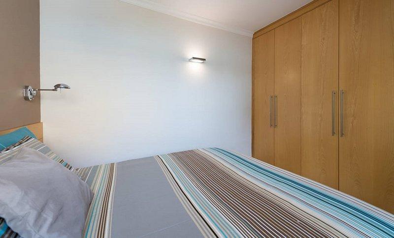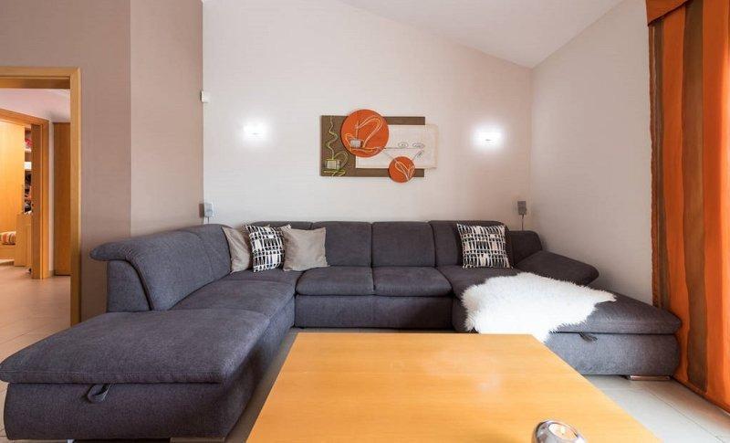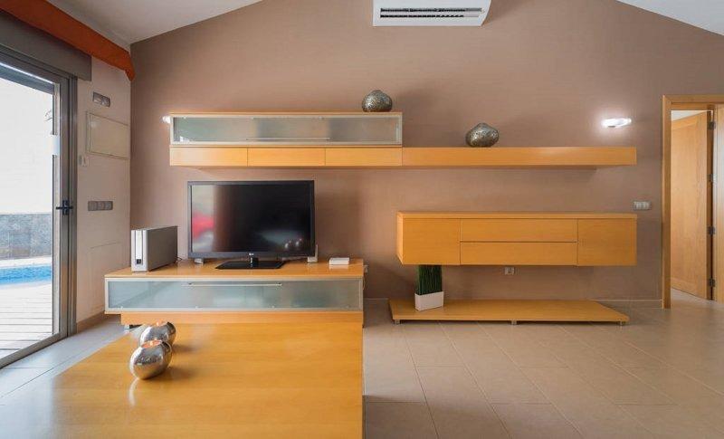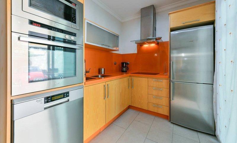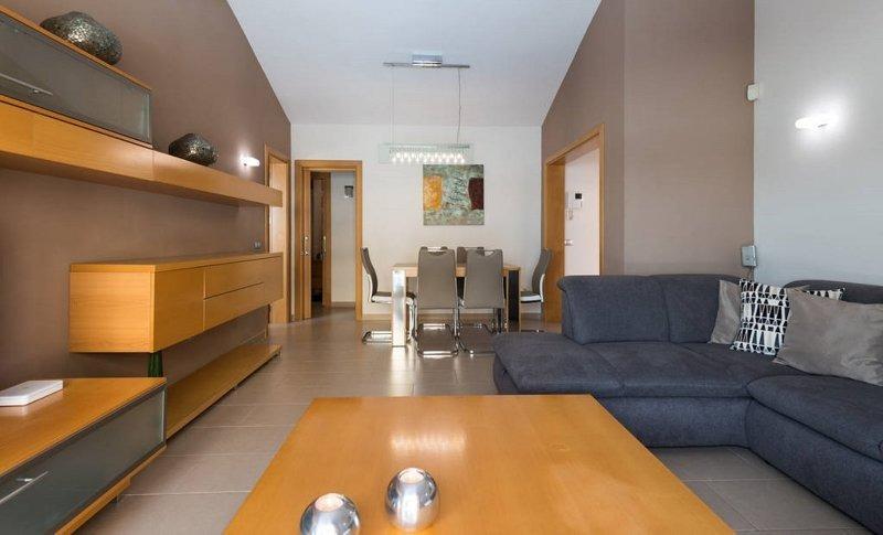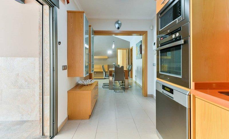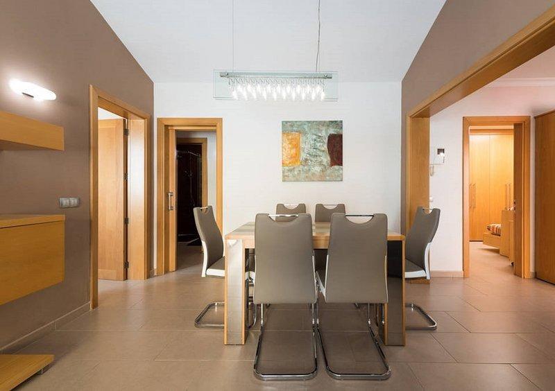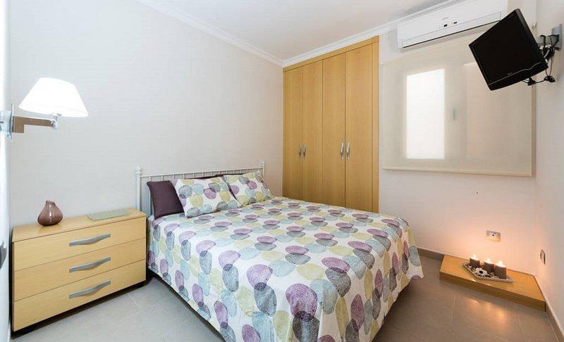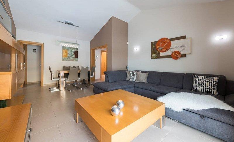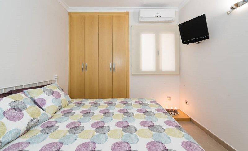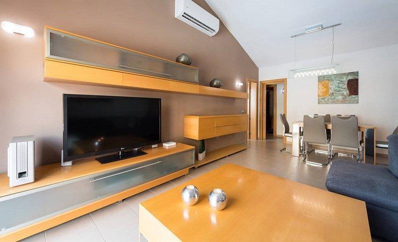 The interior features an open-plan living area with modern furnishings, air conditioning, and a flat-screen TV. The fully equipped kitchen includes essential appliances and cooking utensils, while the dining area allows for family meals or entertaining guests. Each bedroom is thoughtfully designed for comfort, ensuring a restful stay.