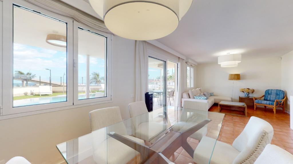 This beautiful villa, featuring a colonial-style façade, is located in the tranquil area of Las Burras beach. Sleeping 5-6 guests across three air-conditioned bedrooms on the upper floor, the villa offers comfortable accommodation, while the ground floor houses spacious living areas including a lounge with internet access and a fully equipped kitchen.Outside, a south-facing pool allows guests to enjoy the sun all day, complemented by a barbecue area and a covered terrace with tables and chairs for alfresco dining. The garden provides a relaxing setting to unwind after a day on the beach.