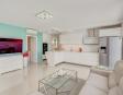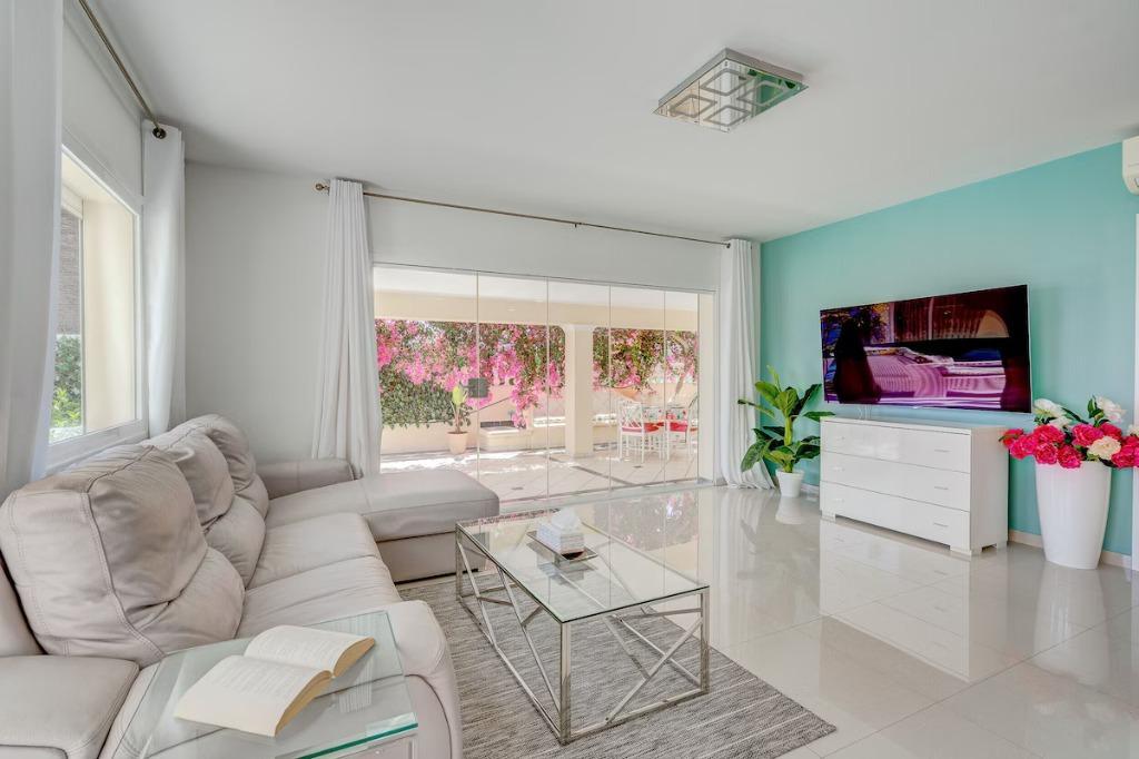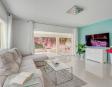 The interior is modern, bright, and welcoming. The open-plan living area offers comfortable seating, large windows allowing plenty of natural light, and direct access to the outdoor space. The American-style kitchen is fully equipped with all appliances and utensils, making it ideal for preparing meals and dining together at home.