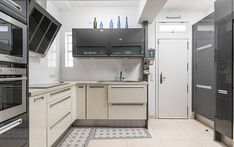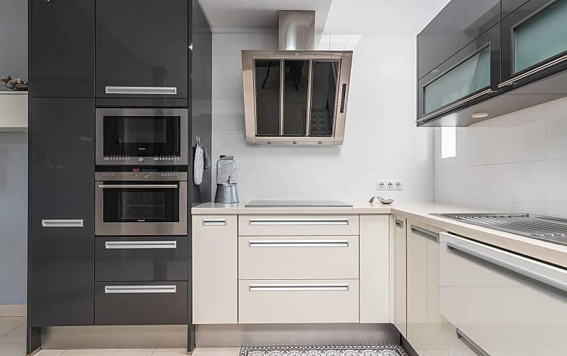 Fully equipped kitchen: microwave, oven, coffee maker, juicer, kettle, and all essential utensils.